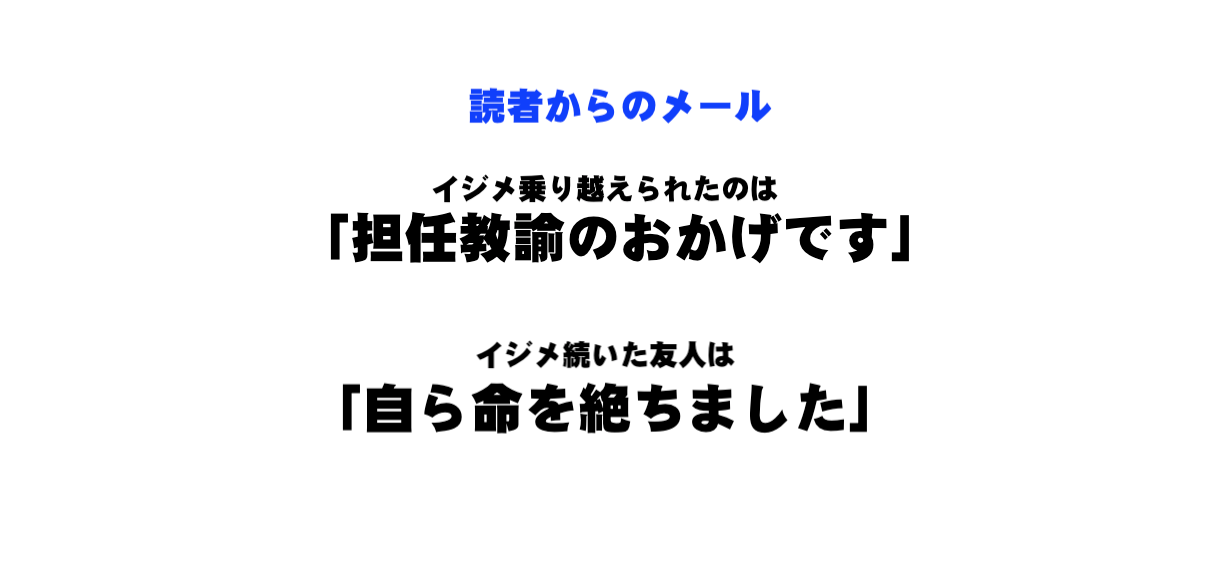 「あの辛い時を乗り越えられたのは、担任の先生がとても親身になってくれたからです。帰り道いじめられないようにと家まで送ってくれたこともありました。
