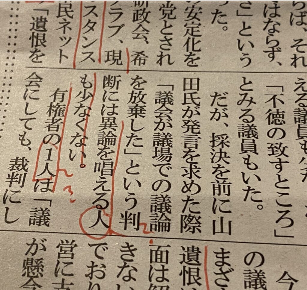 今回の問責決議の直前に自らの意思で解散した会派・民主市民ネットについて、A記者は次のような原稿を書いています。