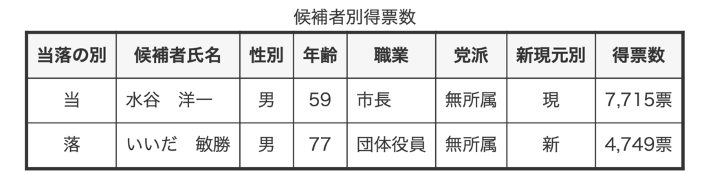 現職の水谷市長の得票数は約7700票、対する飯田氏は約4700票。