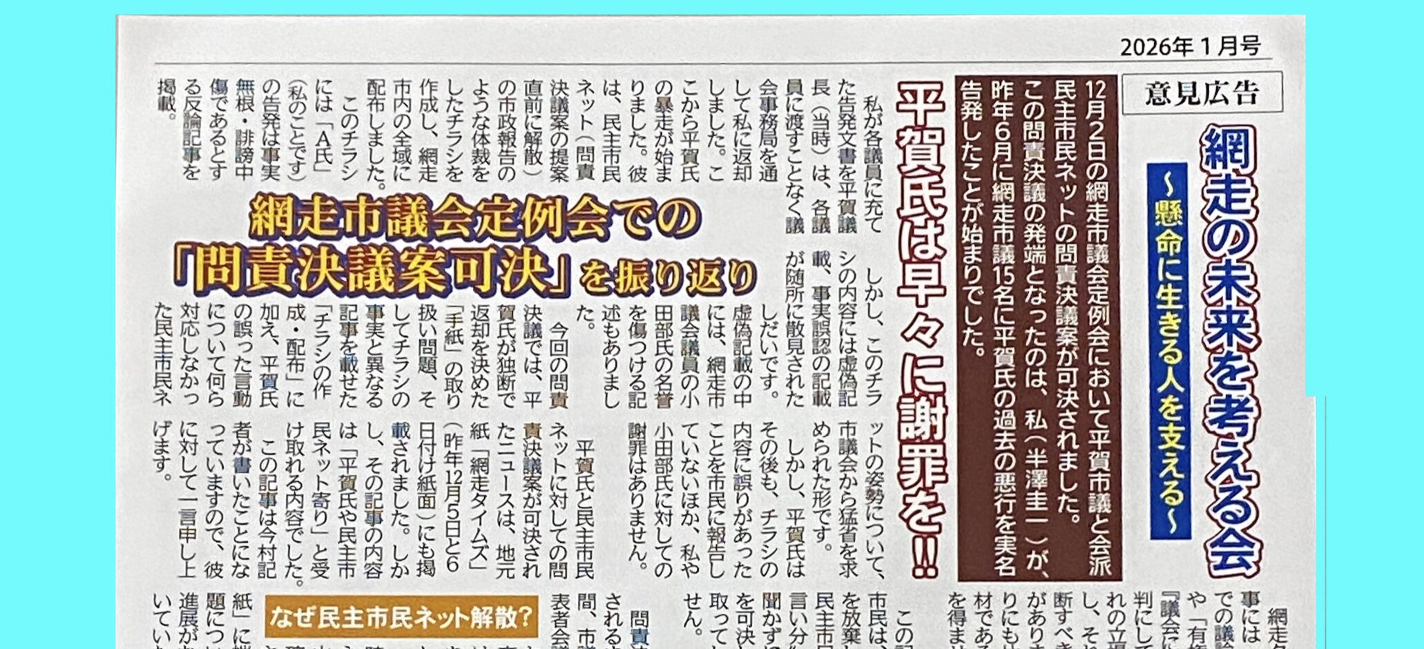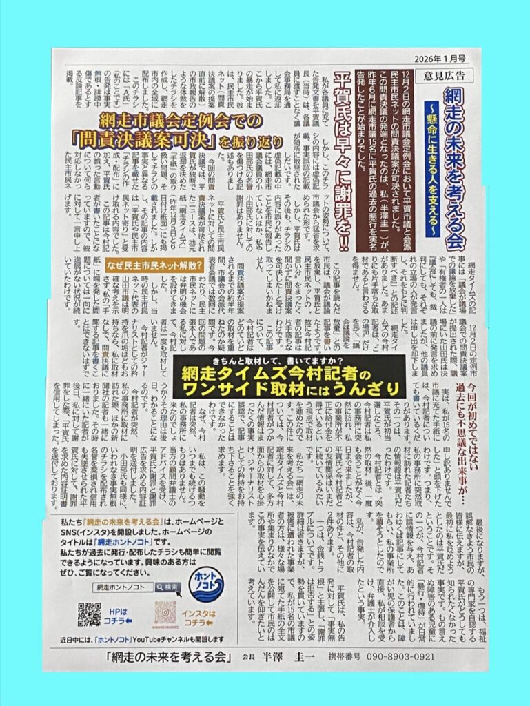 私たち「網走の未来を考える会」代表の半澤氏は、網走市議の平賀氏への抗議文と謝罪を求めるチラシを作成し、市内のほぼ全戸に配布しました。