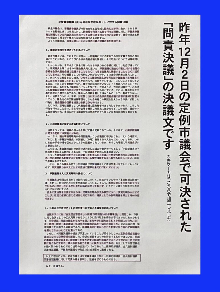 今回のチラシ裏面には、先日の網走市議会で可決された、平賀氏と同氏が所属していた会派・民主市民ネットに対する問責決議の決議文を掲載。全文が読めるようにしました。
