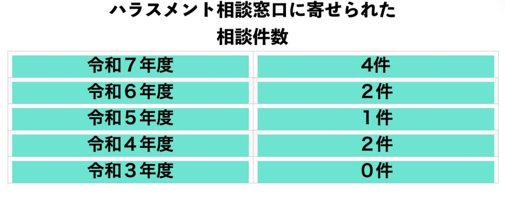 地元記者が得た情報を基に、「ハラスメント相談窓口」に寄せらた相談件数は以下の通りです。